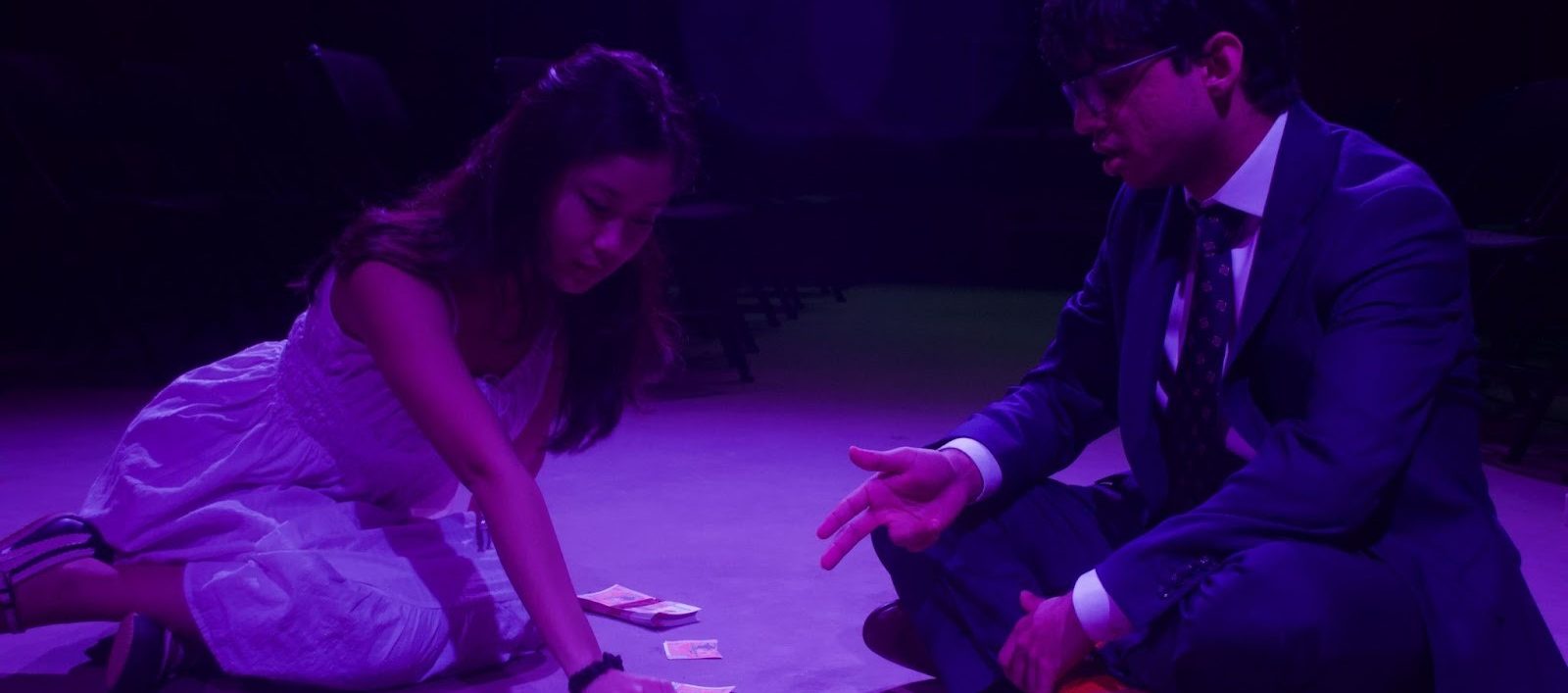 As the audience is seated mere inches from the actors, looking back and forth between these two portions of the set, akin to a metronome ramping up in speed, we are drawn into the adrenaline of the plot. I did not think much of the no-show reserved chair beside me in the front row until the performers sprang from the seat, drawing us into the company’s corrupt machinations.