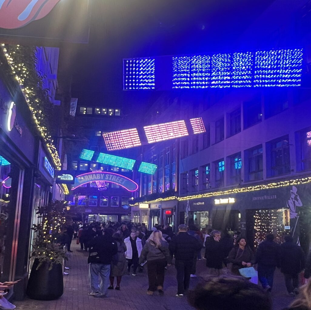 If you want to unlock your inner tourist and see the Christmas lights on some of London’s most renowned streets, why not hop on an open-top bus? Or if you’re looking for a slightly cheaper alternative, you can instead board the 139 at Oxford Street under the sea of celestial-themed lights. Marvel at the lights as the bus turns onto Regent’s Street, passing under the ceiling of angels and the famous Hamleys’ Christmas windows, before heading towards Picadilly Circus, Trafalgar Square and down the Strand. If you fancy yourself a walking tour, consider adding in Carnaby Street, known for its changing annual theme. This year’s display, ‘All is Bright’, is vibrant, colourful, and one not to miss.